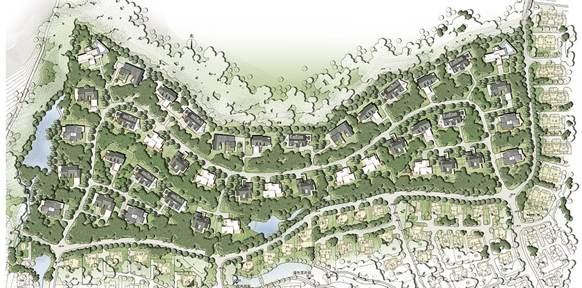 大面積的景觀綠化,加之大面積的天然活水塘使居住的環境品質得以提升。以原始地形、地勢為依托,尊重天然的基地景觀特點,通過建筑與基地的互補關系,進行微地形改造處理。每種戶型均有與之適應的一組相似地塊,使土方開發量保持最低,使人們在生活中自覺地感受山地帶來的無窮樂趣。